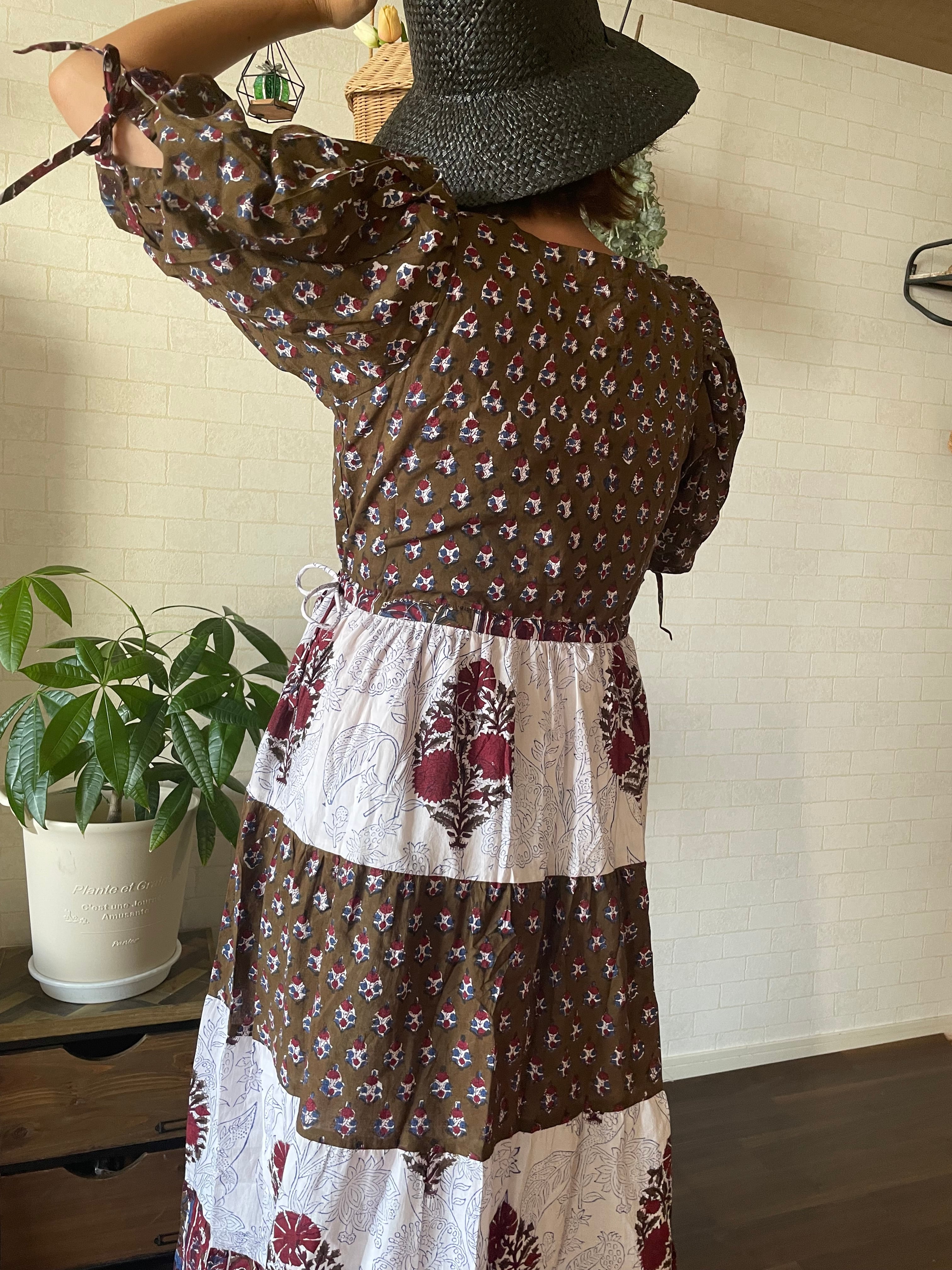 インドの伝統工芸であるブロックプリントは職人さんが一つ一つ手作業でスタンプを押して作られています。カラーやプリントの模様はそのたびに少しずつ異なるので一つとして同じものはありません。一期一会のワンピースとの出会いです。