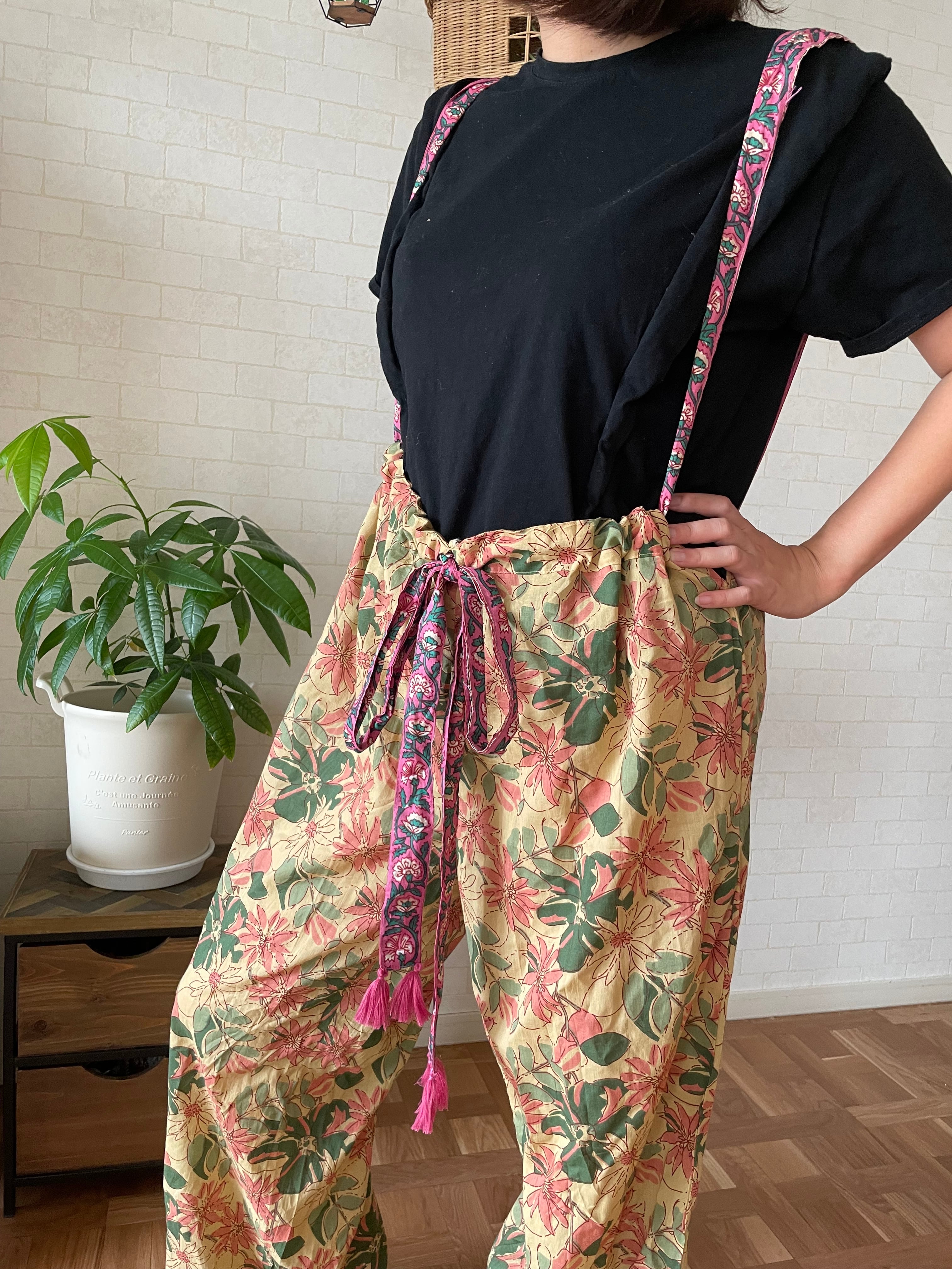 くすみベージュにベビーピンクとベージュとグリーンの大きい花柄、肩紐はショッキングピンクのボーダー生地、リボンの先のピンクのタッセルがポイント!
