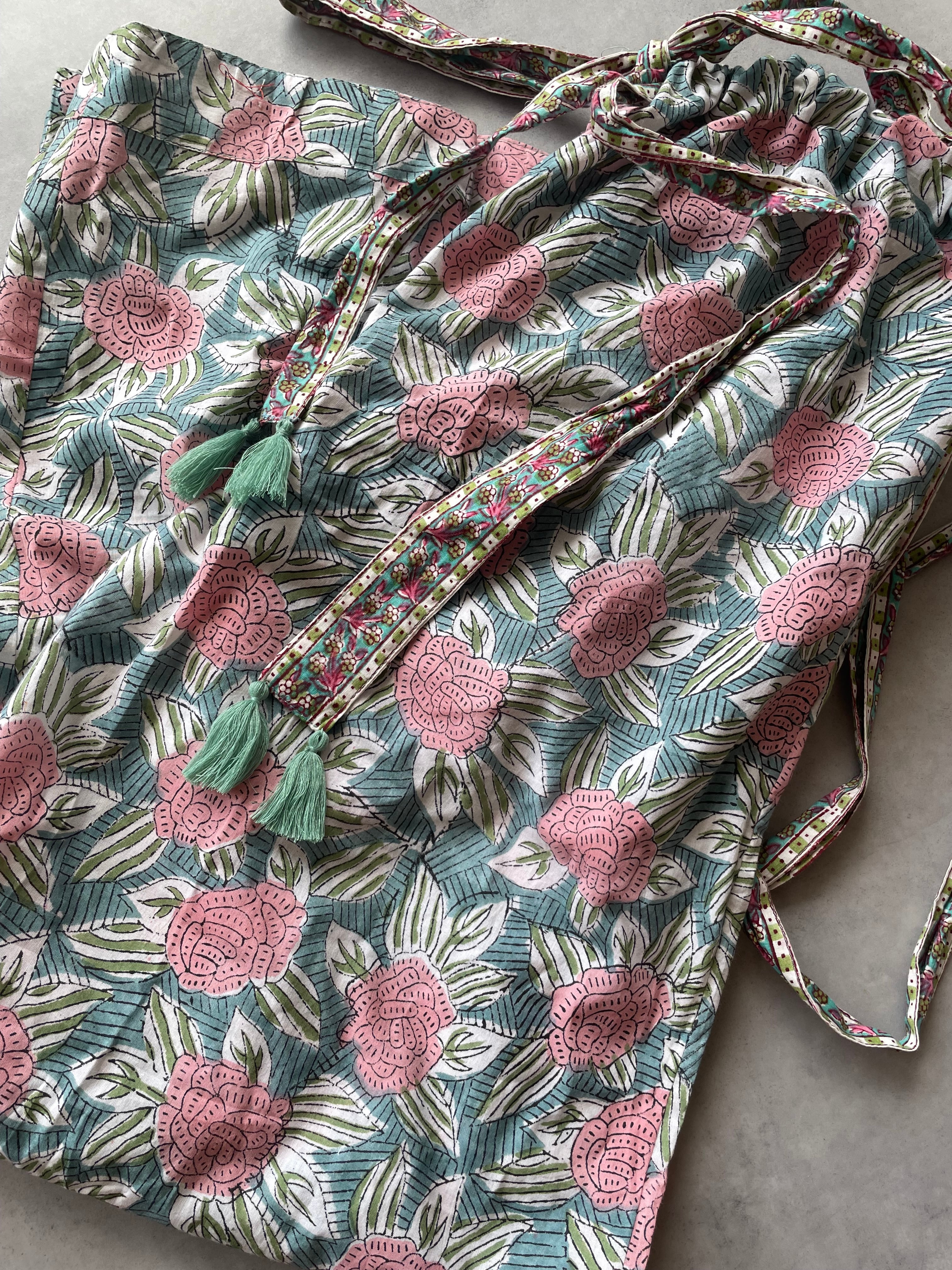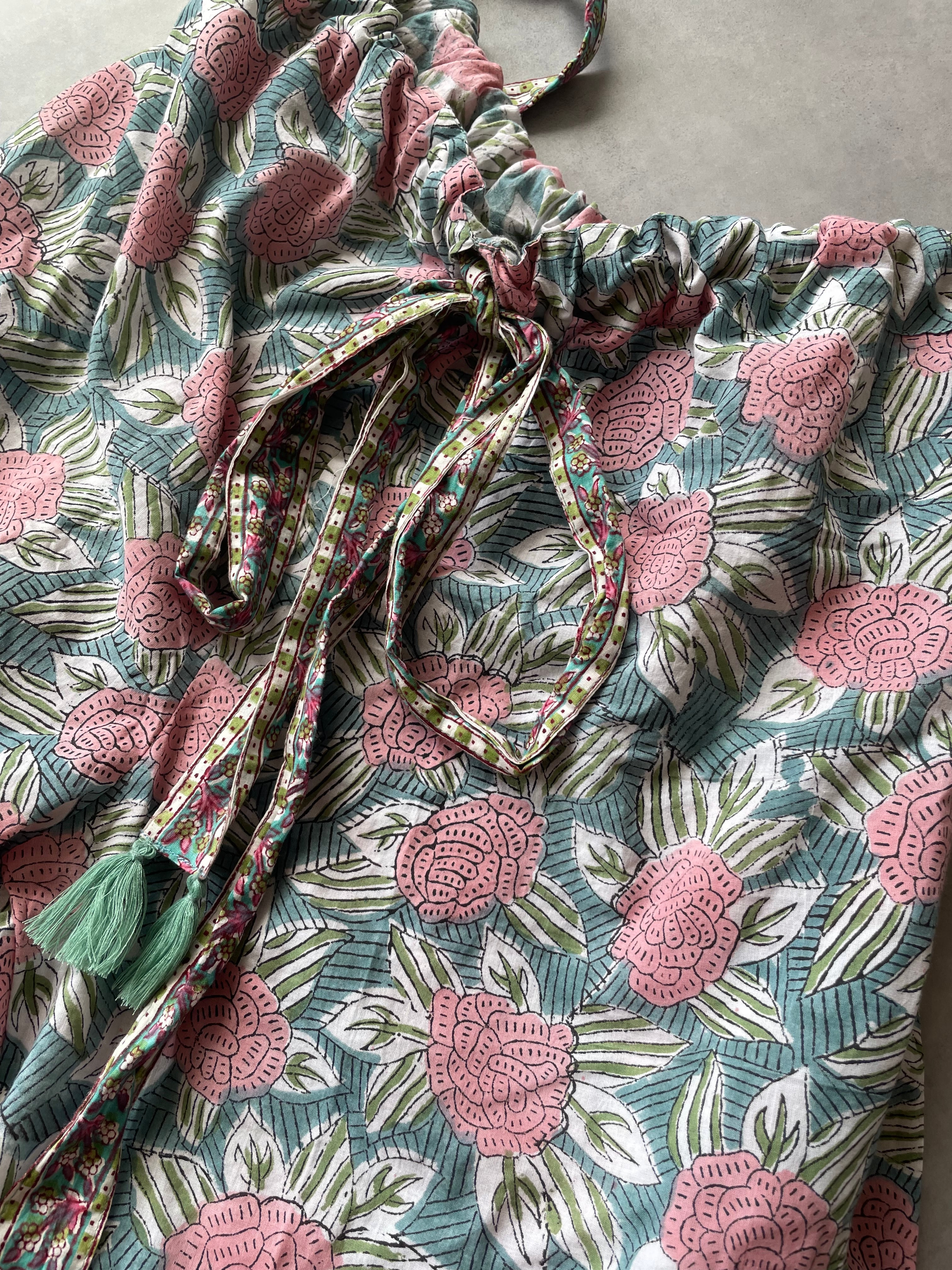 インドの伝統工芸であるブロックプリントは職人さんが一つ一つ手作業でスタンプを押して作られています。カラーやプリントの模様はそのたびに少しずつ異なるので一つとして同じものはありません。一期一会のワンピースとの出会いです。