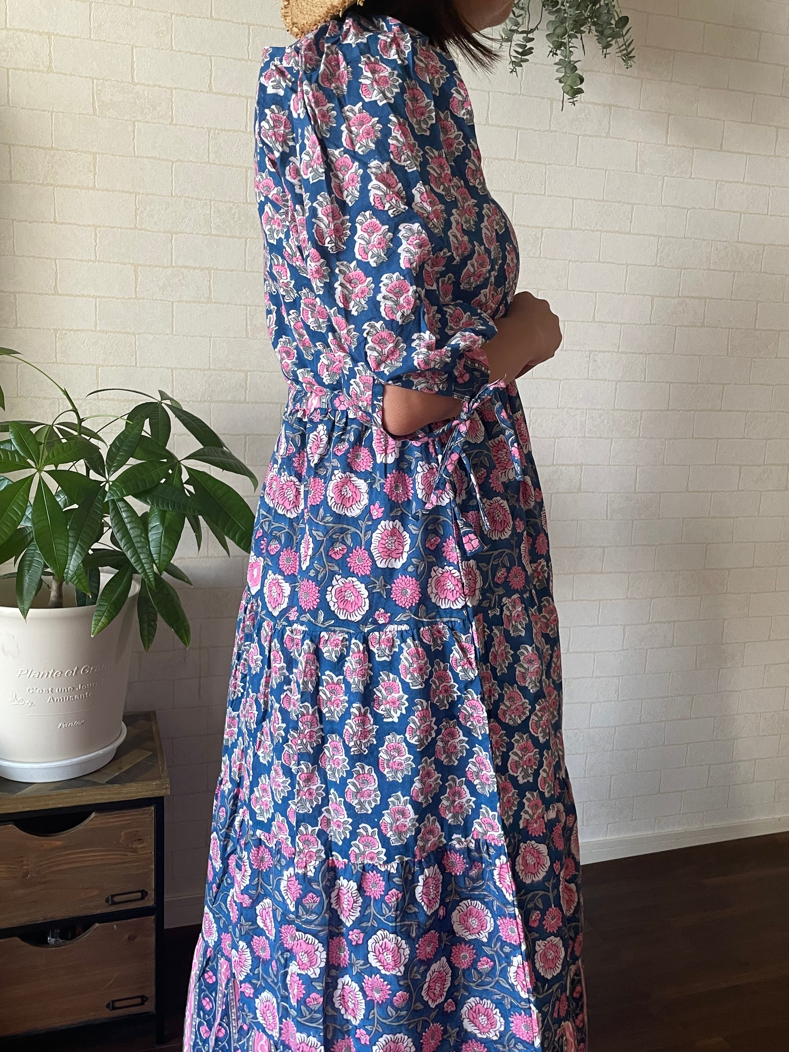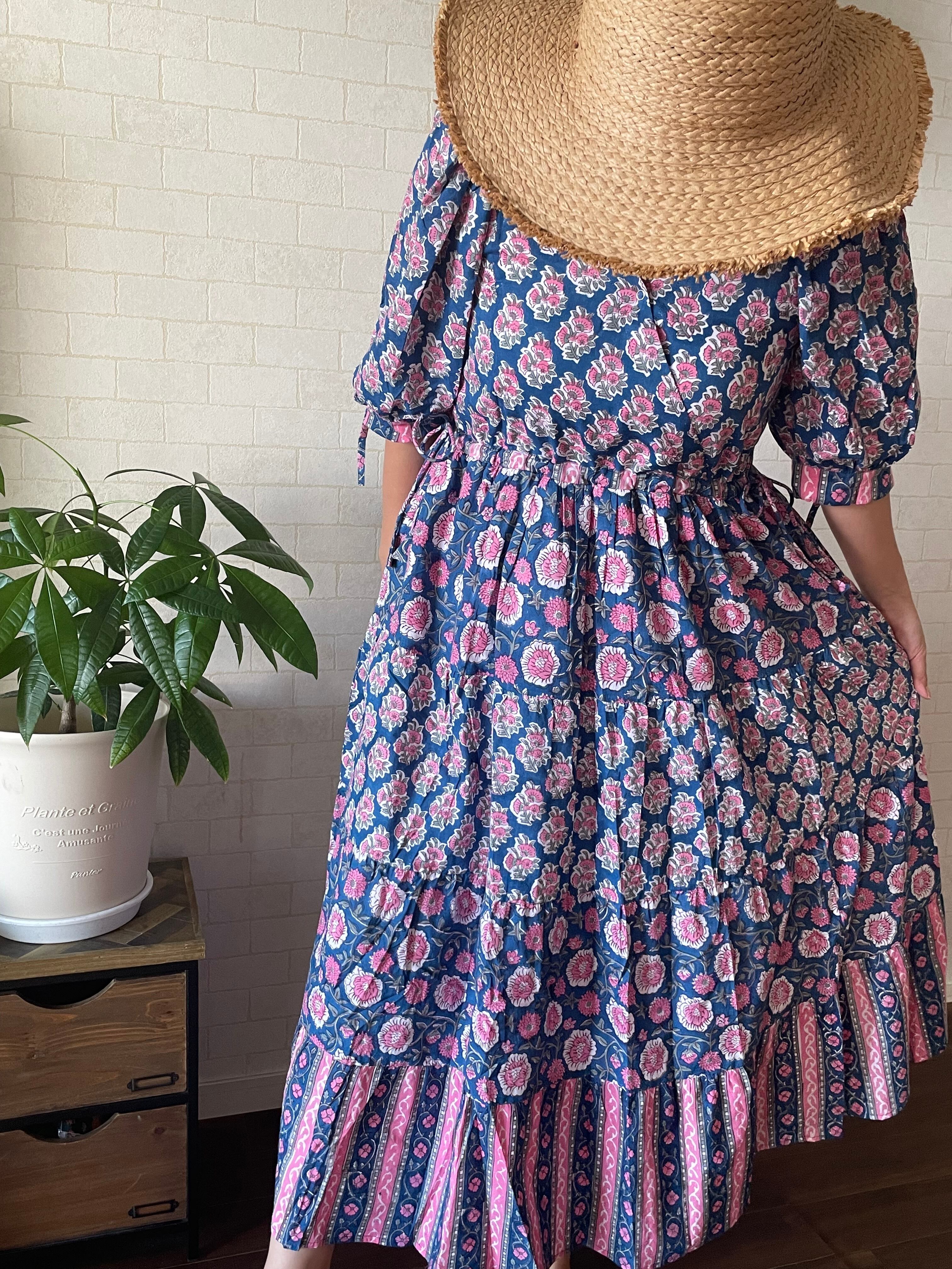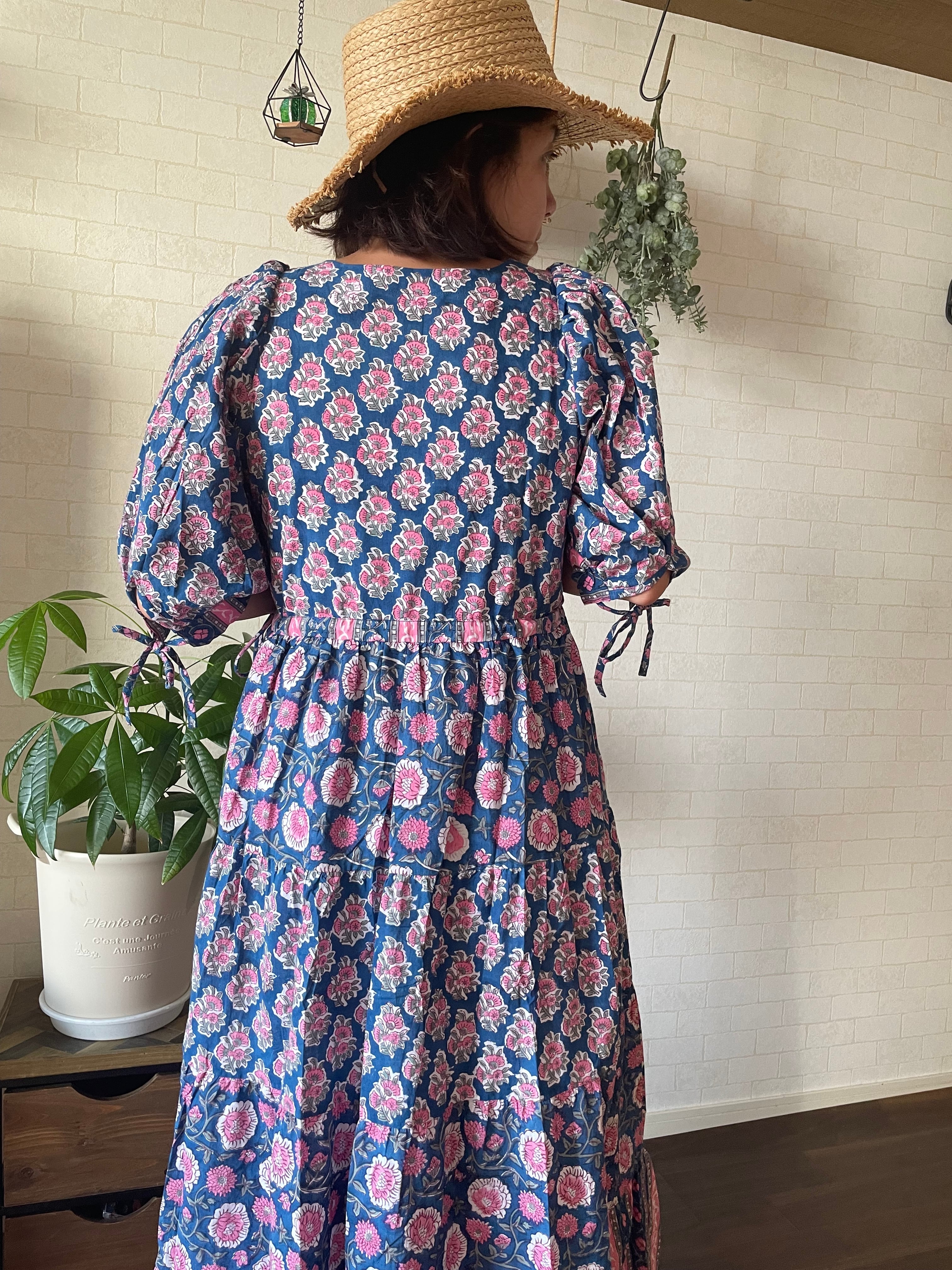 インドの伝統工芸であるブロックプリントは職人さんが一つ一つ手作業でスタンプを押して作られています。カラーやプリントの模様はそのたびに少しずつ異なるので一つとして同じものはありません。一期一会のワンピースとの出会いです。