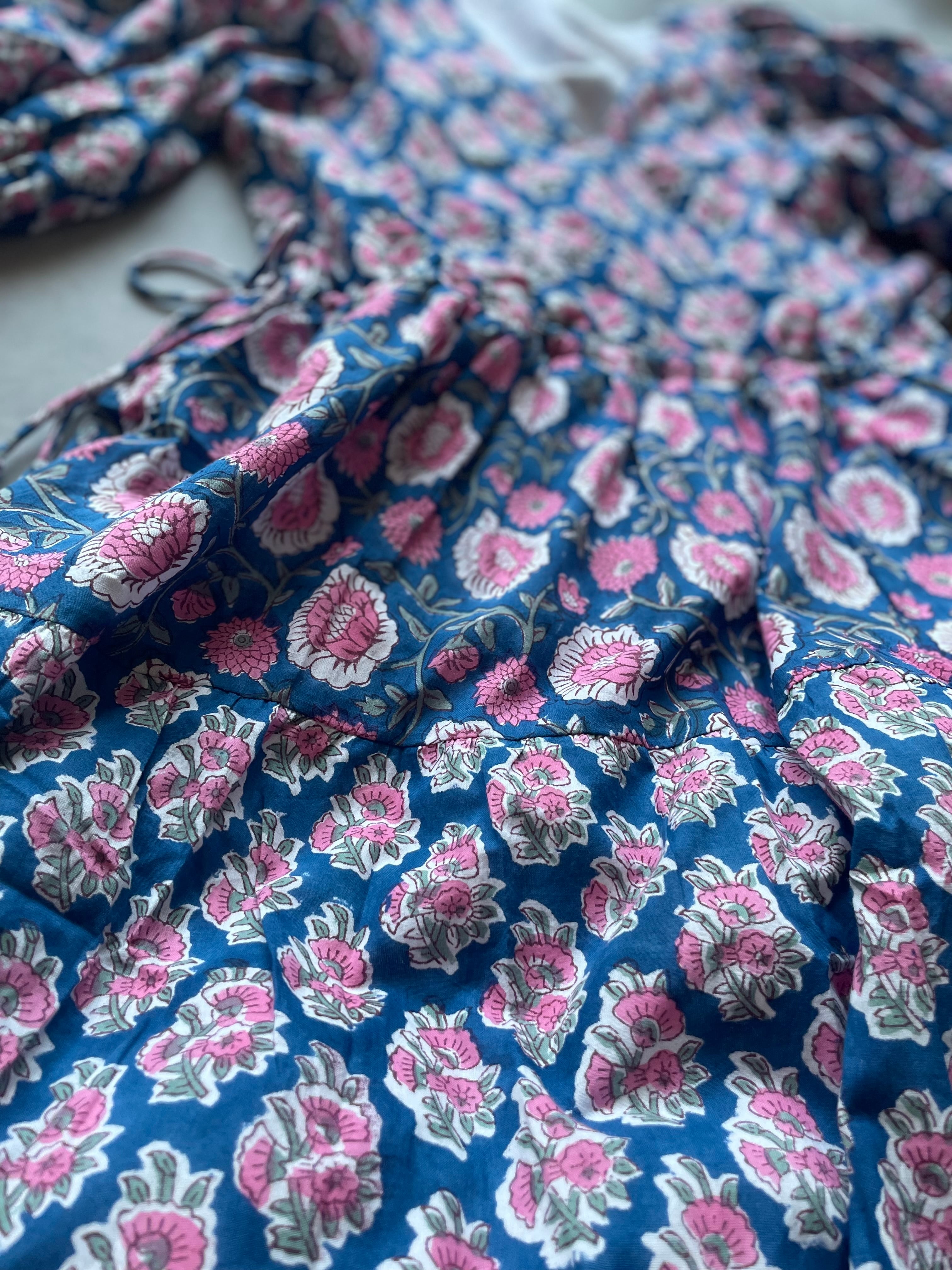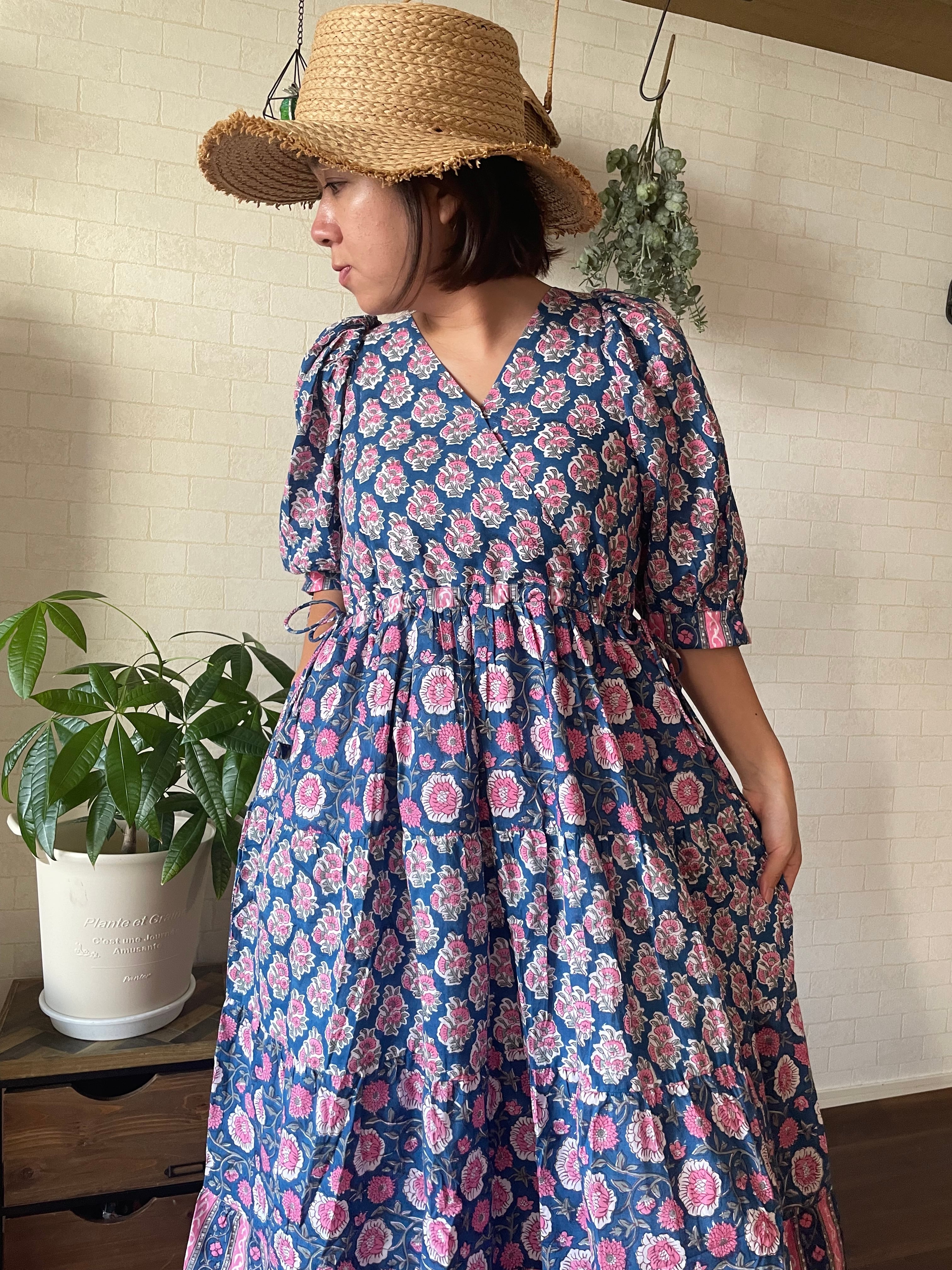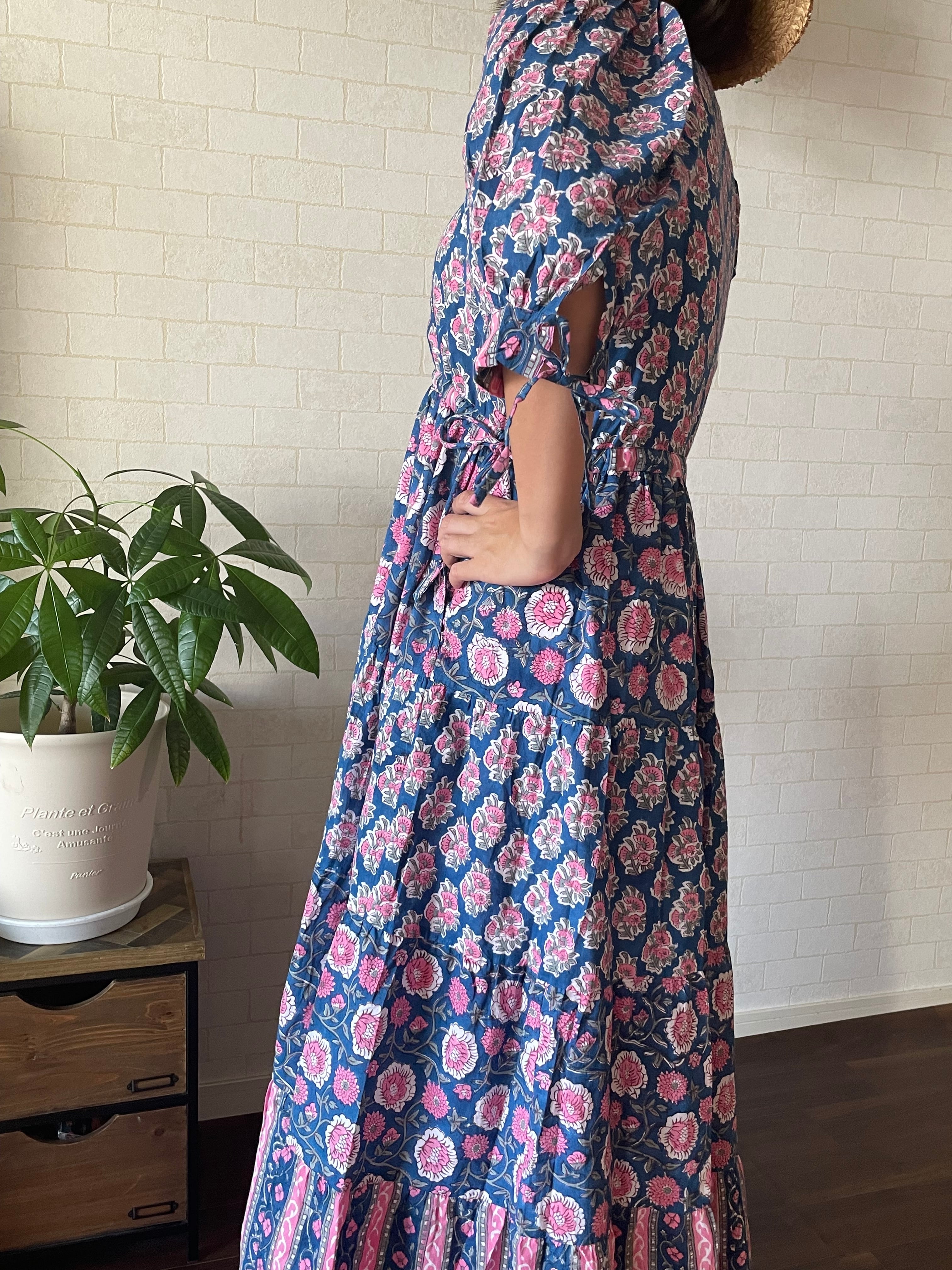 インドの伝統工芸であるブロックプリントは職人さんが一つ一つ手作業でスタンプを押して作られています。カラーやプリントの模様はそのたびに少しずつ異なるので一つとして同じものはありません。一期一会のワンピースとの出会いです。