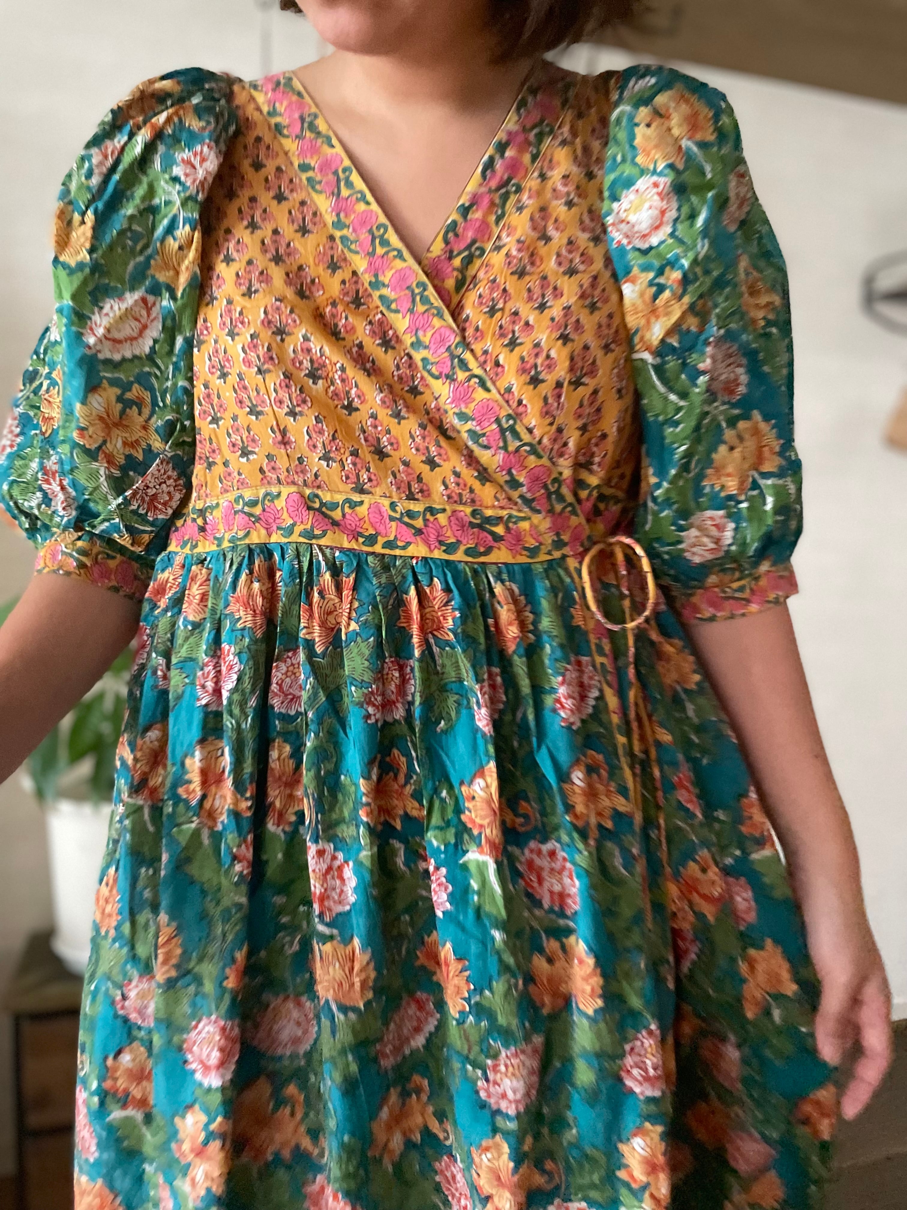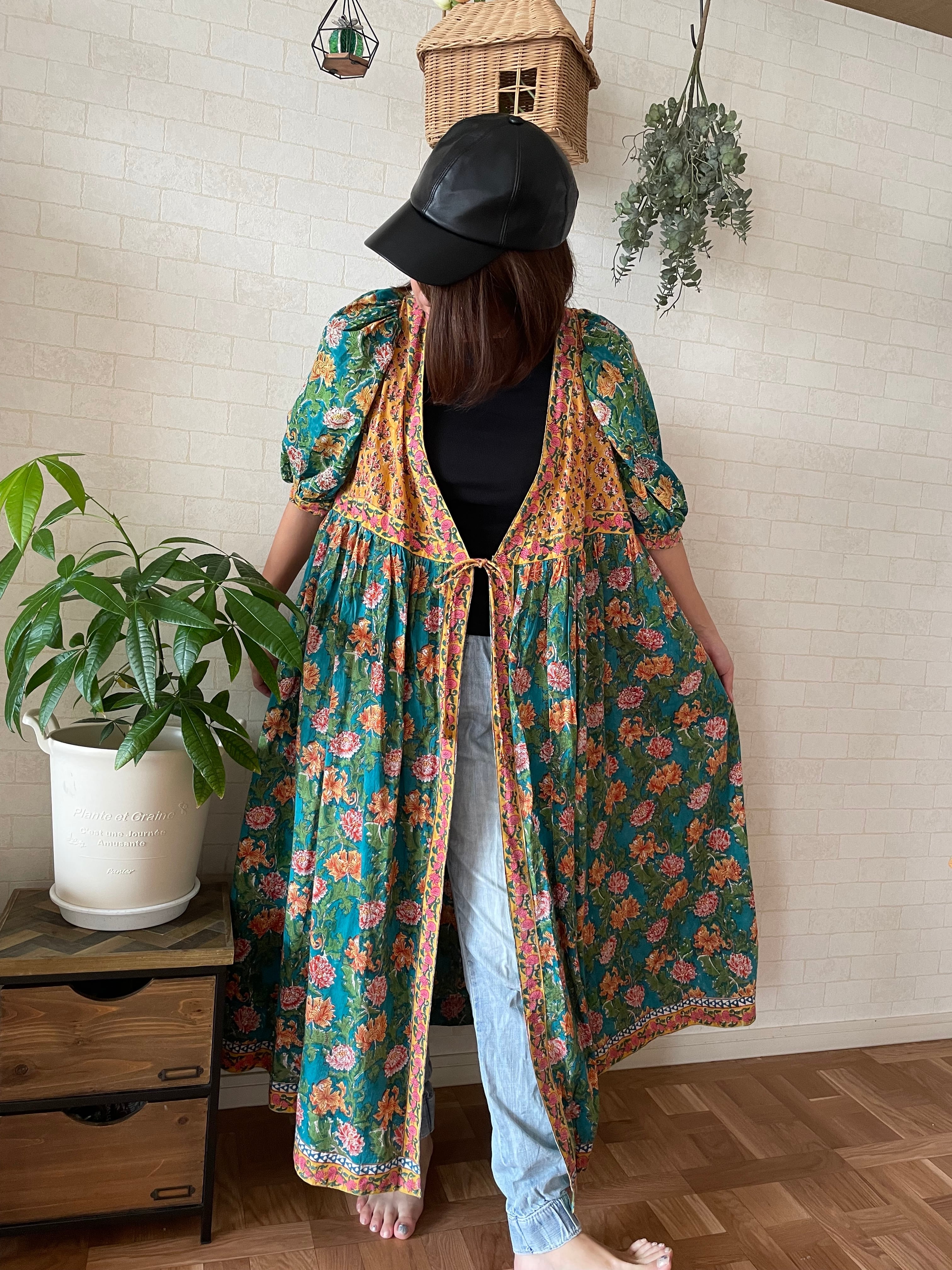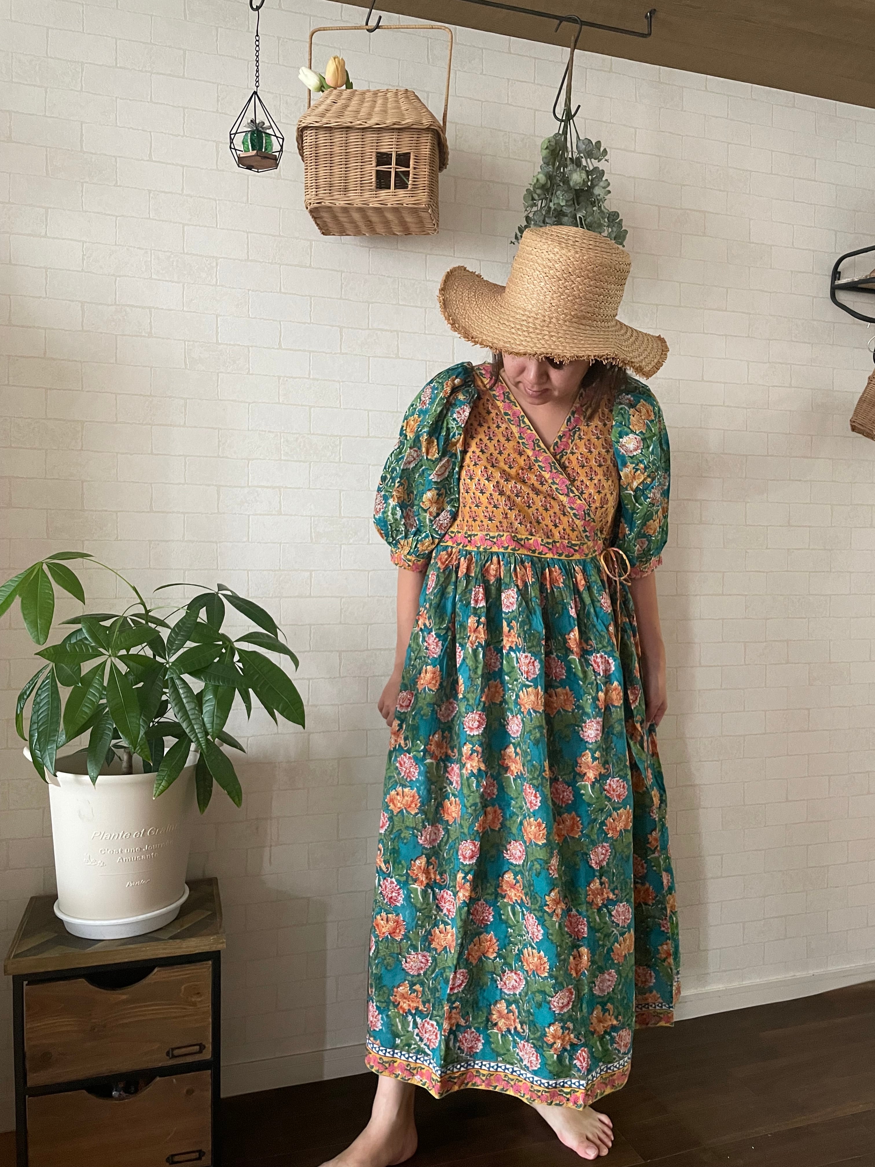 スカートと袖部分はエメラルドグリーンの生地、身頃部分はイエローにピンクの小花柄。